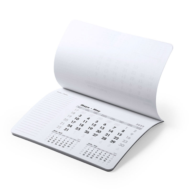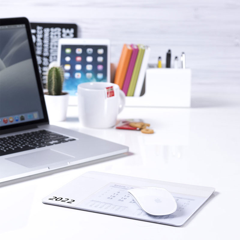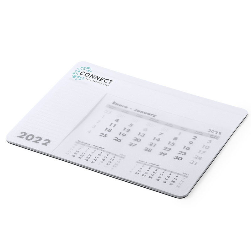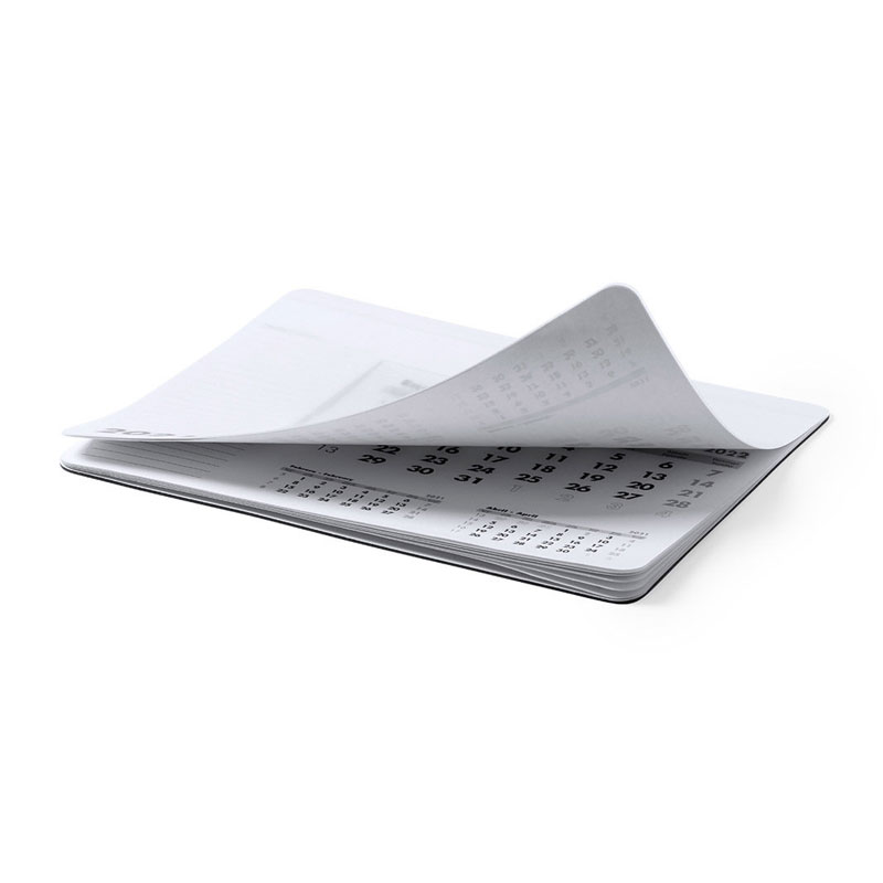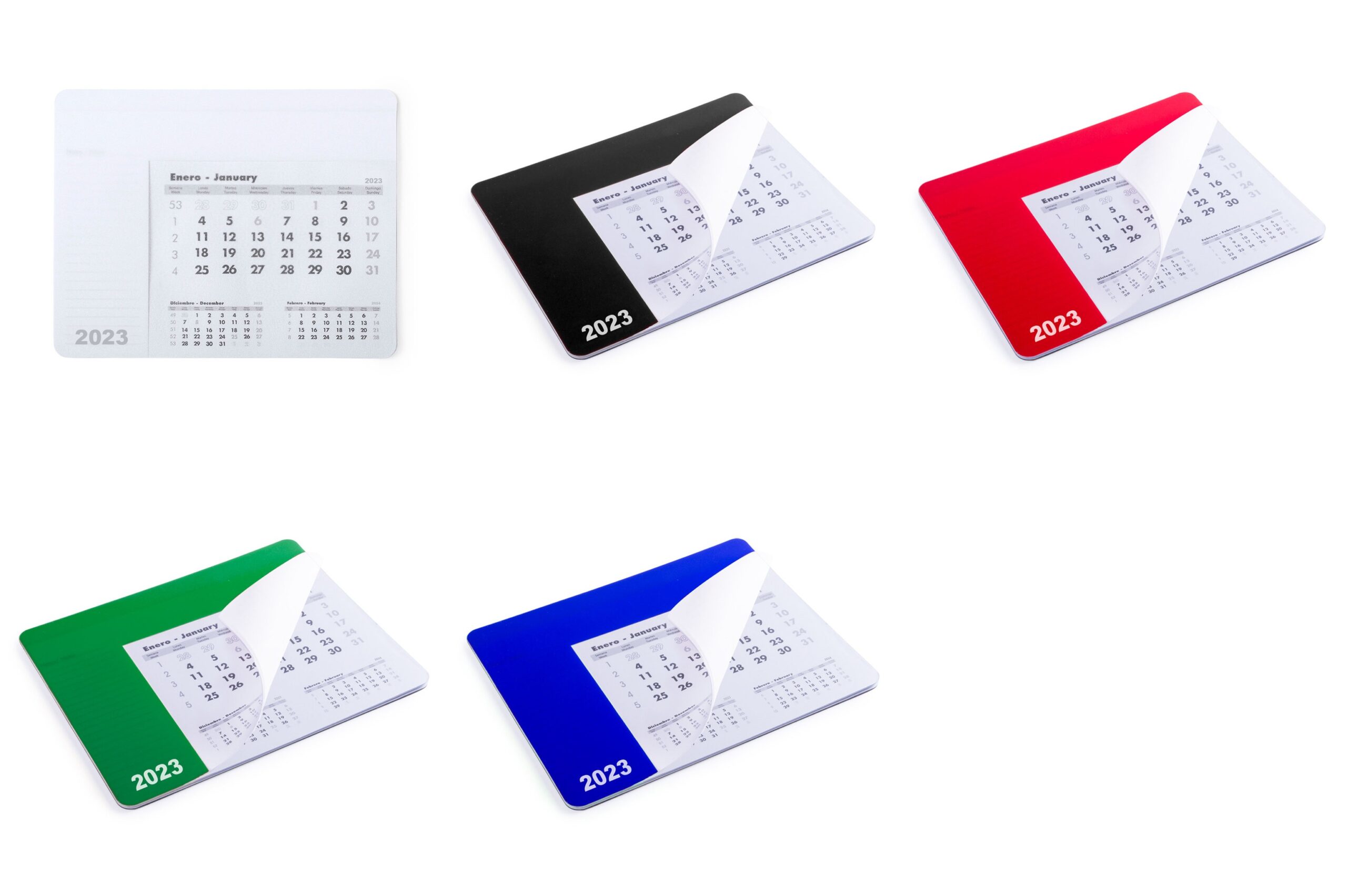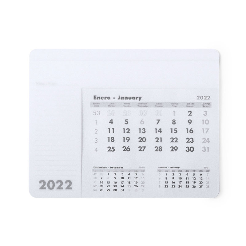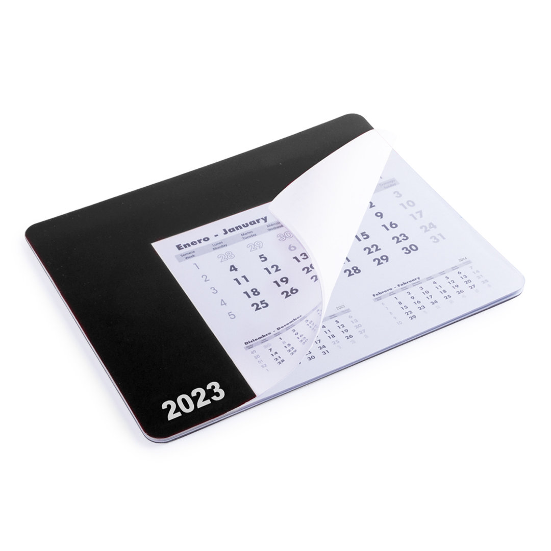 This calendar mousepad features 12 inside sheets, showcasing the current, previous, and upcoming periods, along with a notes area. It includes a transparent protective cover and a non-slip padded base for stability.