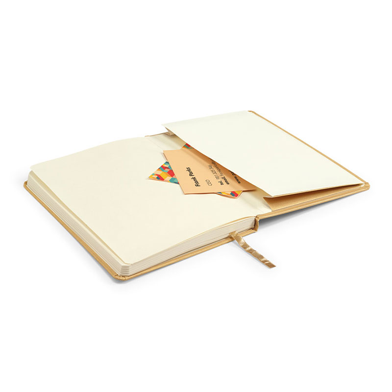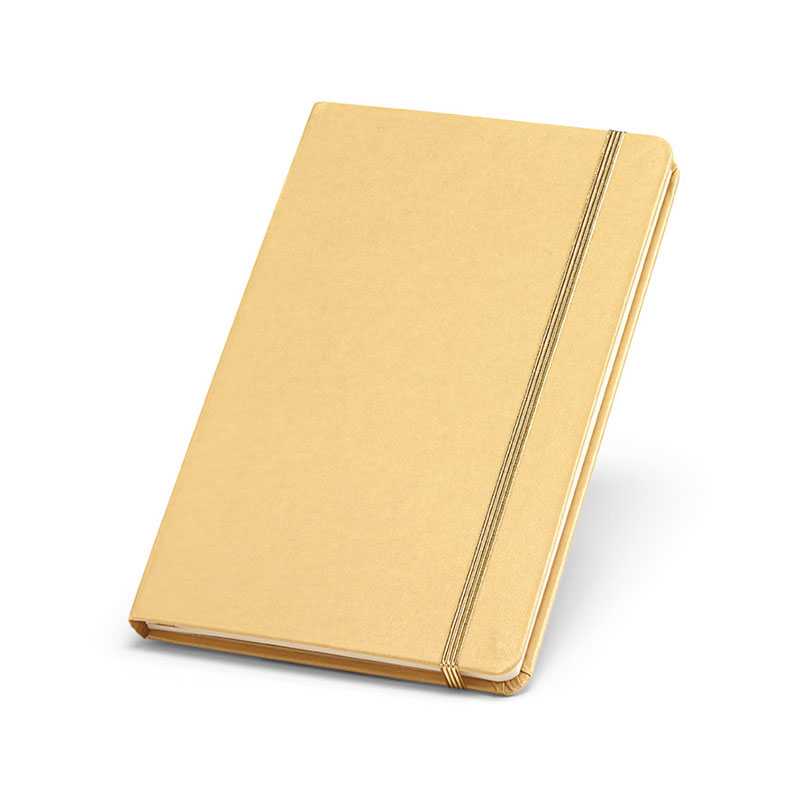 A5 notepad with 160 plain ivory pages, inside pocket, bookmark ribbon, elastic band and metallic hardcover (gold or silver).