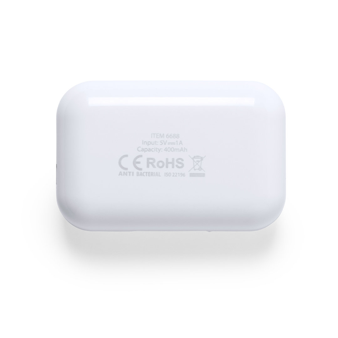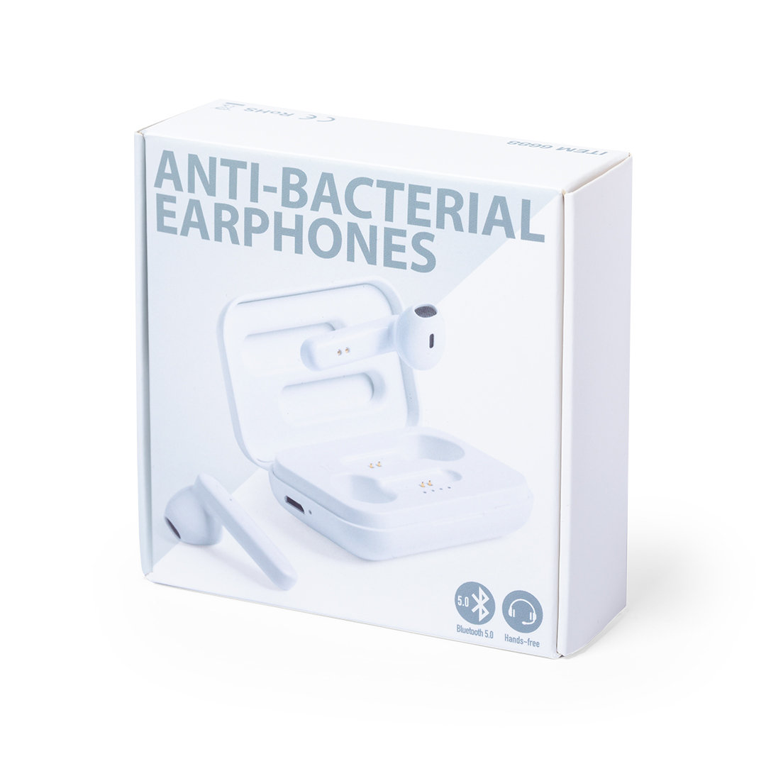 Antibacterial earphones with Bluetooth® 5.0 connection in an elegant white color design in glossy finish. Ergonomically designed, including an integrated, touch control button in the earphone, with matching color charging base. Hands free function and rechargeable micro USB cable included. Presented in an individual deluxe case with hinged cover and in an attractive design box.