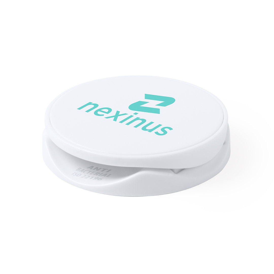 Antibacterial, folding holder for smartphone in an elegant, white color design. Especially designed for pad printing, with 3M adhesive tape, extra strong fixation and residue free when detached from the device.