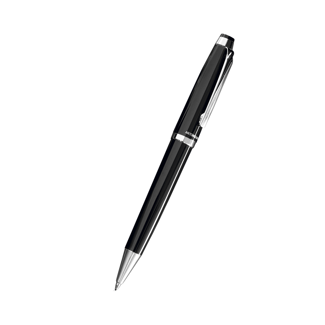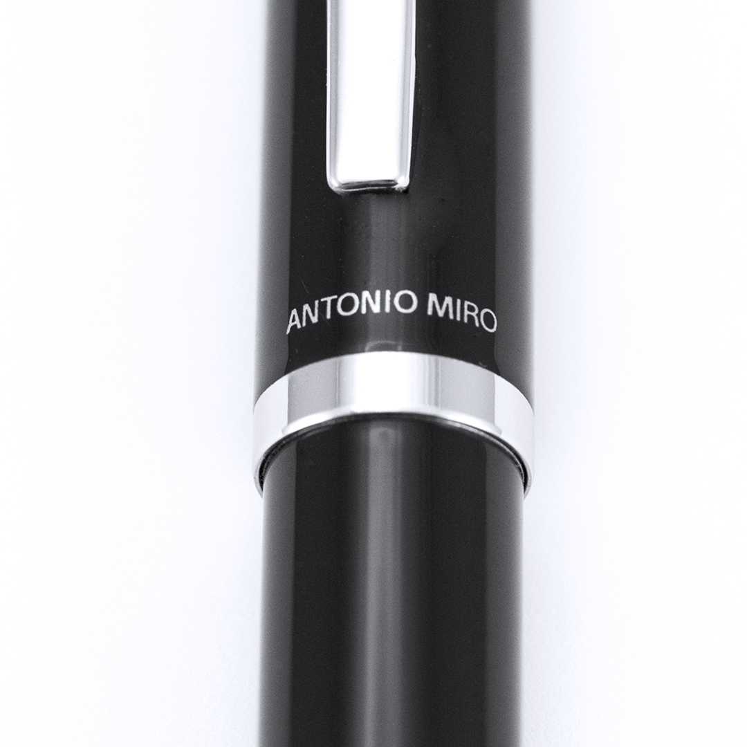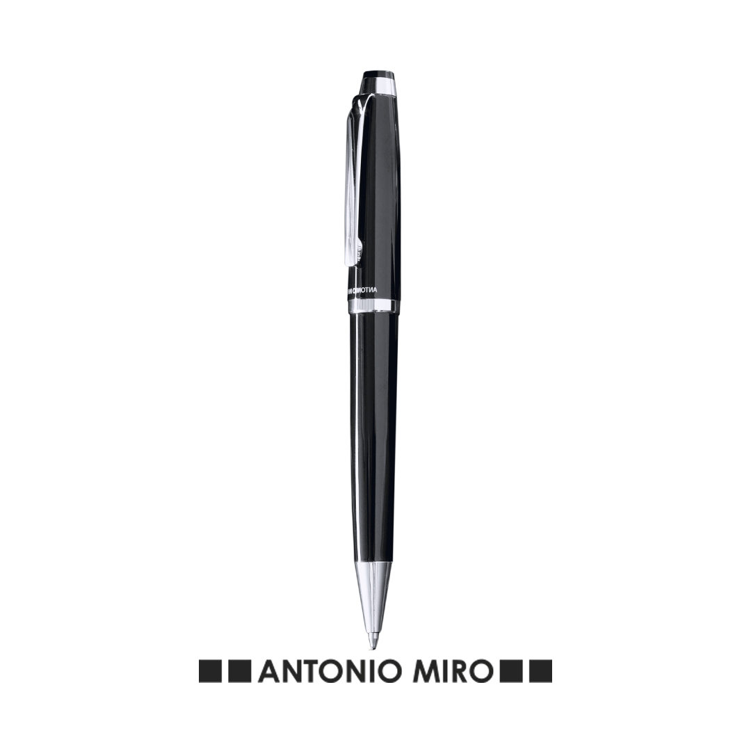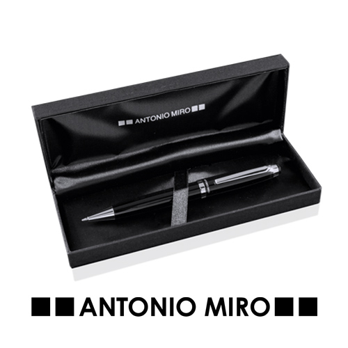 Ball pen by Antonio Miro in an elegant bicolor design and soft metallic body in sober black. With the brand logo on top of the ring, clip and tip in shiny silver finish. Presented in an individual black box with the brand logo. Jumbo cartridge with blue ink.
