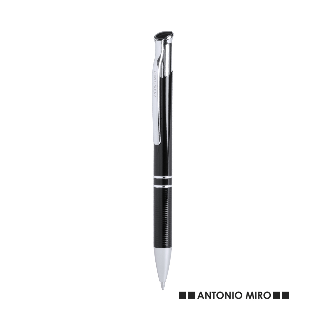 Ball pen by Antonio Miro in an elegant black color design and soft aluminum body with silver colored accessories. Push-up mechanism, with original metal clip and presented in an individual black aluminum case with the brand logo. Blue ink. Graduation