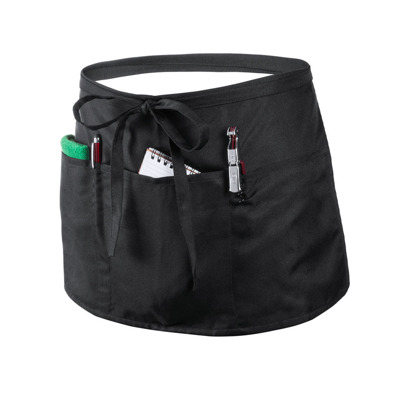 Apron for waist in 100% polyester material, smooth finish in an elegant black. With 2 large pockets, one medium pocket and pen holder. Adjustable by straps.