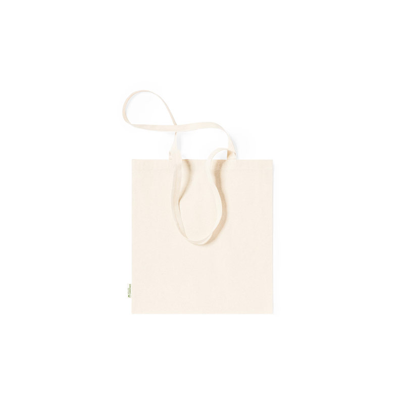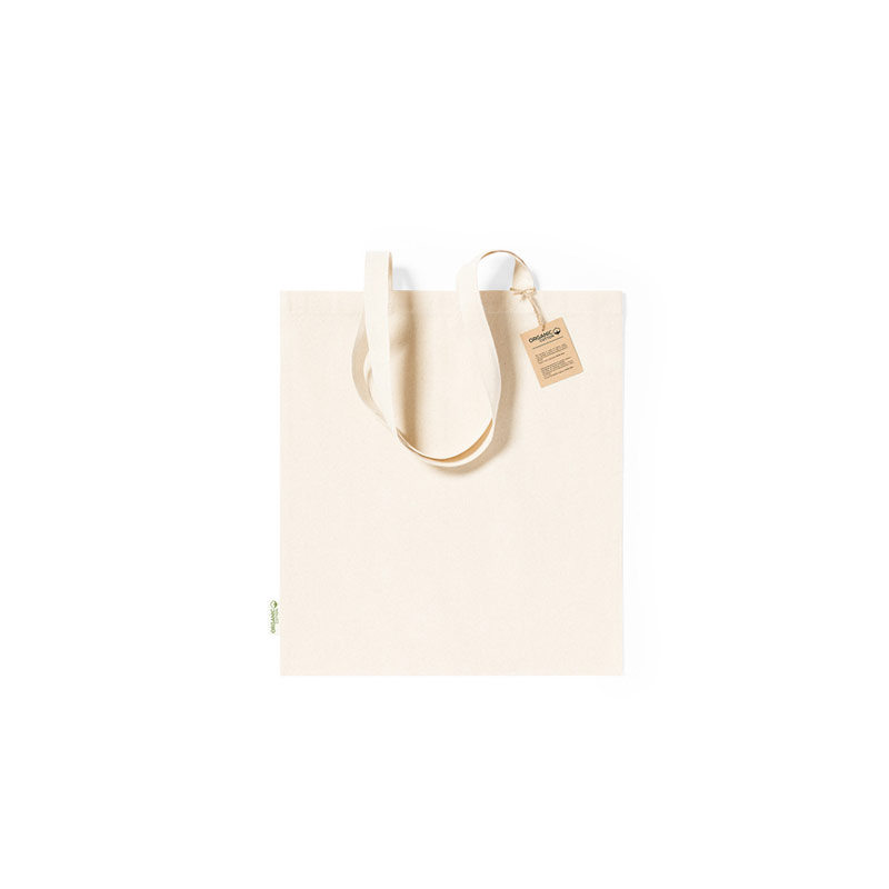 Bag 140g/m2, GOTS certified. Fabrics are made from organic fibers. Stitched natural finish, M size, reinforced handles 70 cm in length. Resistance up to 8kg, organic cotton emblem on label and hangtag in recycled cardboard.