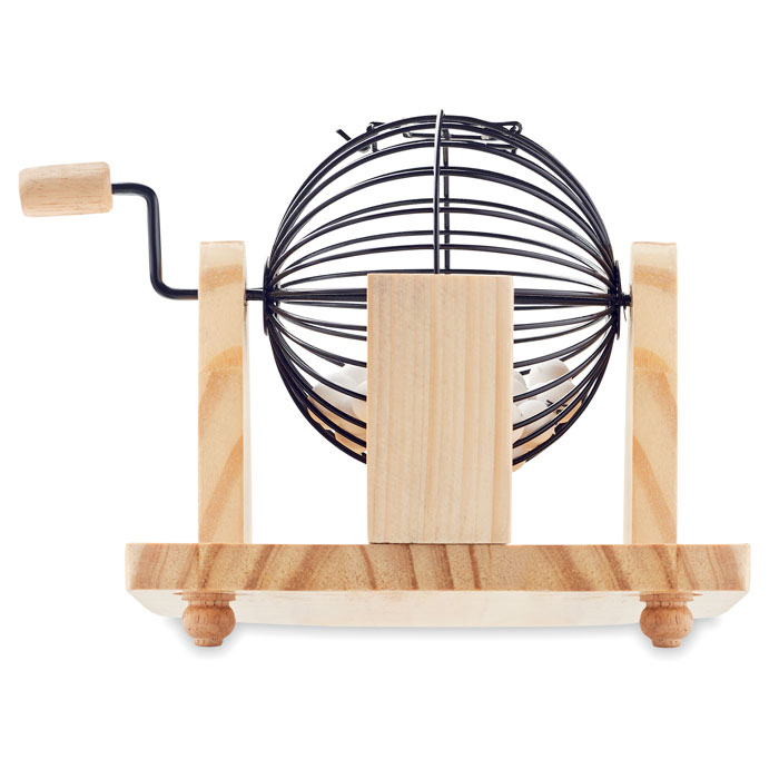 Bamboo bingo game set. Including: bingo caller machine on a bamboo base, caller balls (75 pcs), master board, cards (18 pcs) and marker chips (150 pcs). A fun activity for the entire family, with friends or co-workers. Play a classic game of bingo to pass the time and for some quality entertainment.