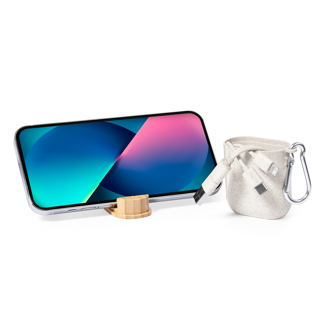 Charger cable made of wheat straw . With Type-C and USB input connections and Type-C, Lightning, and Micro USB outputs. 5V DC 2.4A. Presented in an elegant design case made of wheat straw and bamboo closing lid, with holder function for smartphones. 5.7 x 6.3 x 3.1 cm |