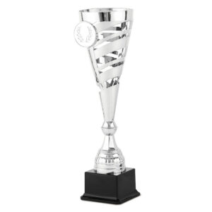 Budget line trophy in silver and gold color with plastic parts, modern design, and marble base to suit various events.