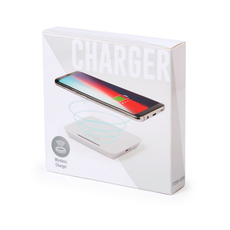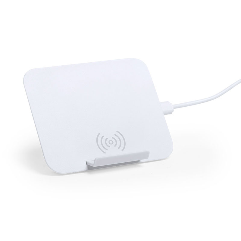 Wireless, sober design charger with smartphone holder function. In monochrome, white color design and including micro USB charging cable. Compatible with devices equipped with wireless charging technology. Presented in an attractive design box.