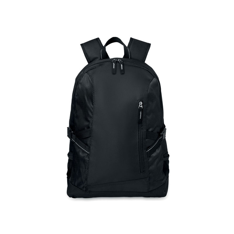 15 computer backpack in 600D with rip stop details. Includes one internal 15 laptop compartment, one main front zippered pocket and 2 side compartments. Adjustable shoulder strap.