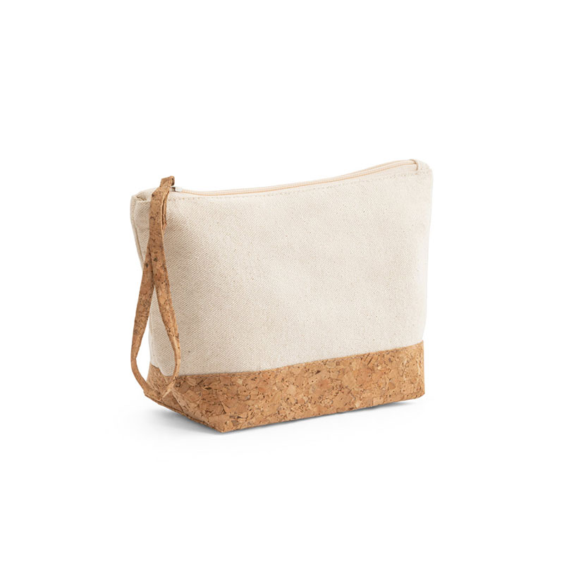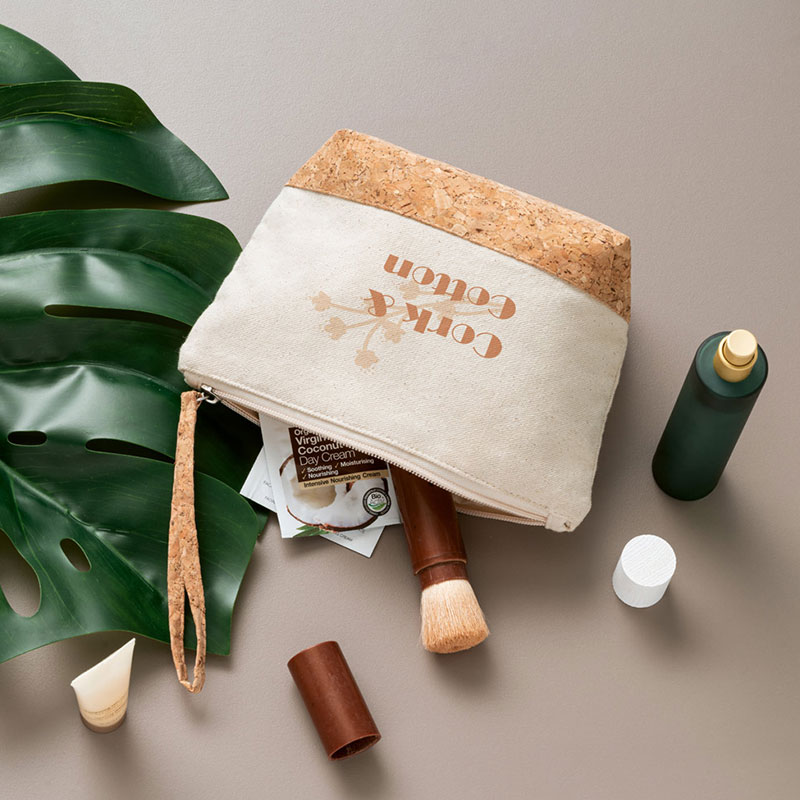 100% cotton cosmetic bag (280 g/m²) with cork details on the bottom and zip puller, which can also be used has a handle for easy transport. Lined interior, easy to clean and quick drying, ideal for storing make-up.