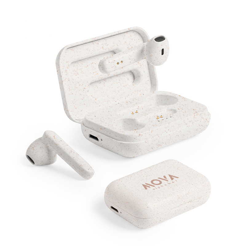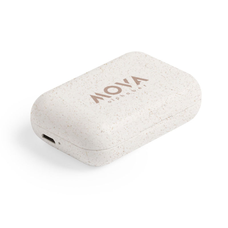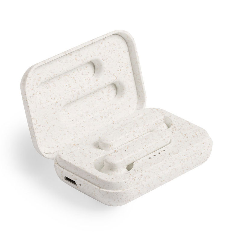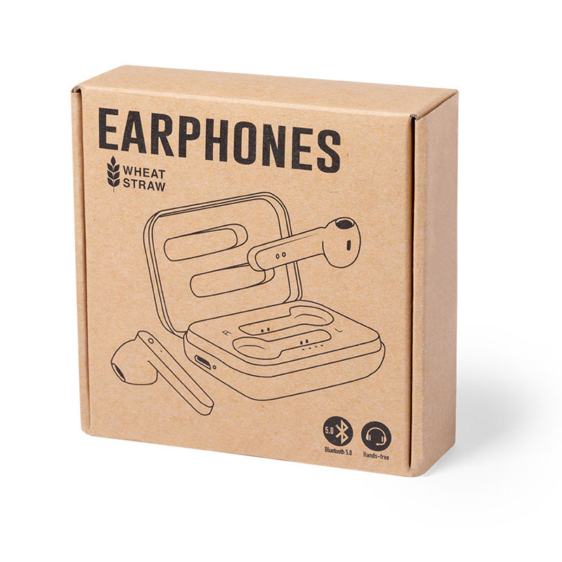 Nature line earphones with Bluetooth® 5.0 connection in wheat straw, to encourage the use of natural raw materials and reducing contaminant emissions. Ergonomically designed, including an integrated, touch control button in the earphone, with matching color charging base and LED light for charging status. Hands free function and rechargeable -micro USB cable included-. Presented in an individual deluxe case with hinged cover and in an attractive, eco design box.