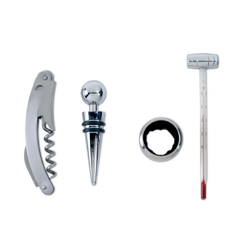 Elegant wine set presented in wooden box. With wine stopper, corkscrew, bottle collar and thermometer.
