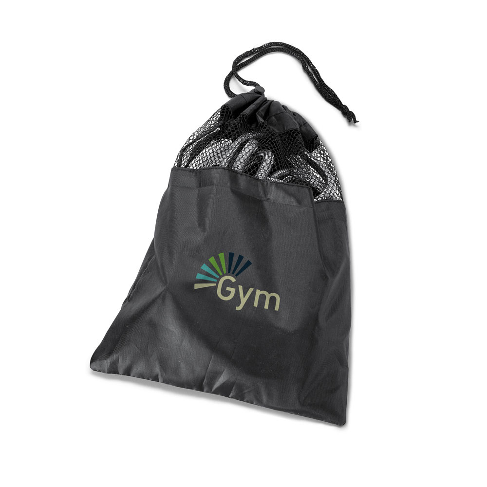 Practical fitness set that includes elastic and skipping rope. Supplied in 190T bag.
