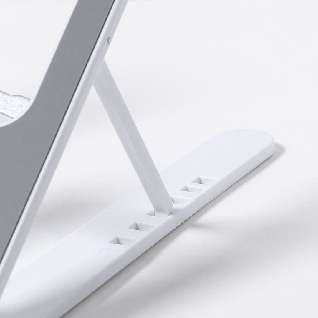 Foldable laptop stand. Made in durable ABS with anti-slip TPR protections for a solid fit to the device. Height adjustable and presented in a suede case with drawstring closure and inside an individual design box.