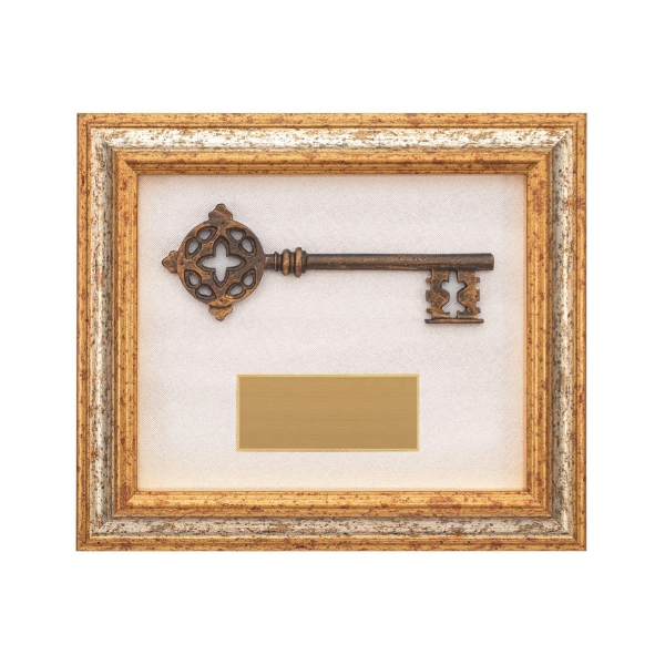 A luxury frame with gold antique key ideal for municipalities and ceremonies. 37cm*32cm. It is personalised with a custom printed plaque.