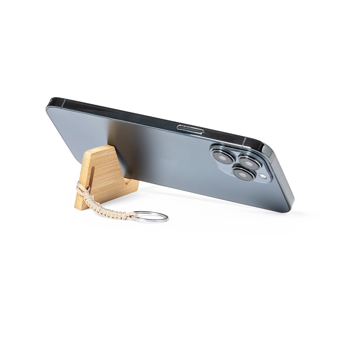 Nature line keychain made in bamboo, with integrated smartphone holder and original string. Presented in individual bag with eco cardboard inside.