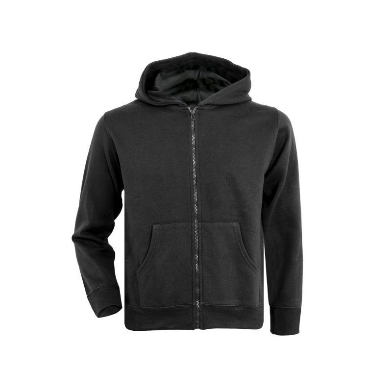 KIDS SWEATSHIRT WITH HOODIE WITH ZIP. 50% COTTON 50% POLYESTER. AVAILABLE IN BLACK COLOR.