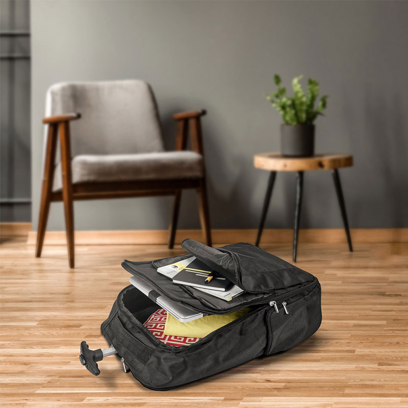 Laptop trolley backpack. 1680d and 300d. main compartment lined and cushioned, with cushioned partition for computer up to 17″. with wheel protection. cushioned handles. Extensible metal handle, spring loaded. Capacity up to 22l.