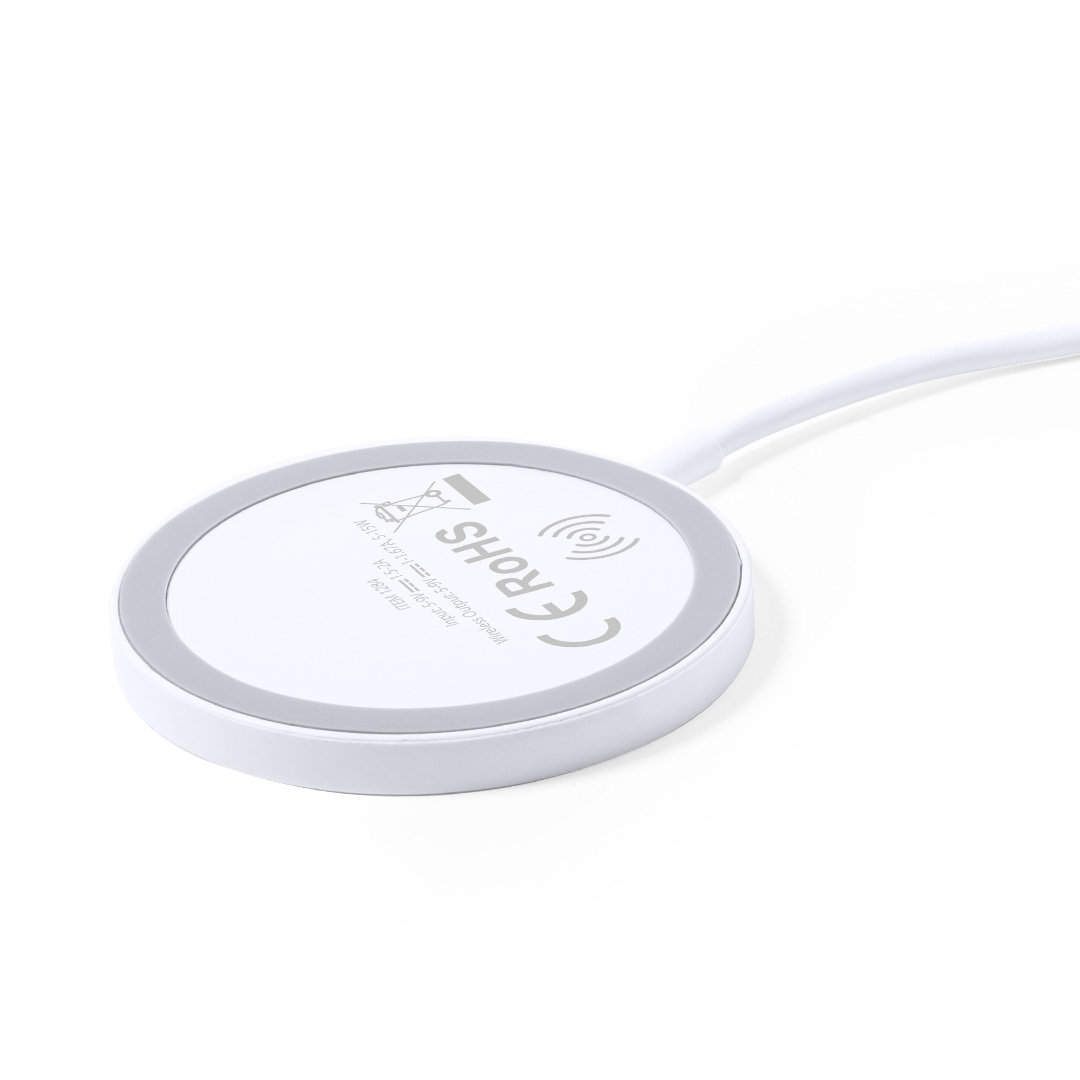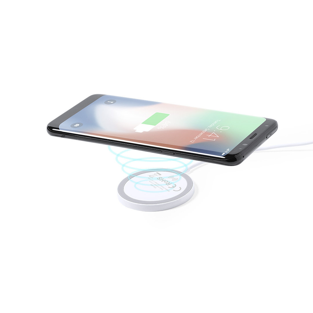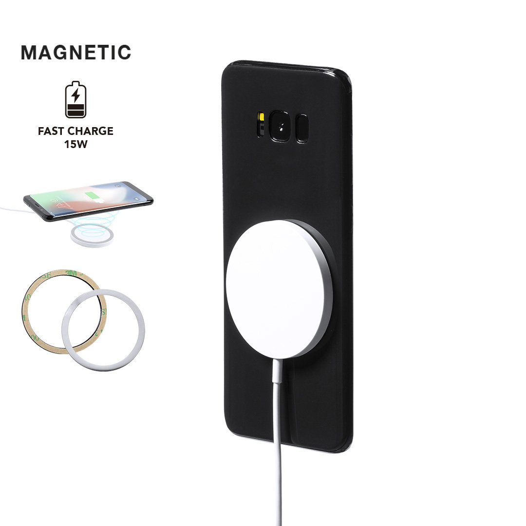 Magnetic wireless charger with 15W charging and 1m USB connection cable. Metal accessory with 3M adhesive, extra strong fixation and residue-free when detached. Compatible with devices equipped with wireless charging technology. Large branding surface and presented in an attractively designed box. Instruction manual available in English and Spanish.
