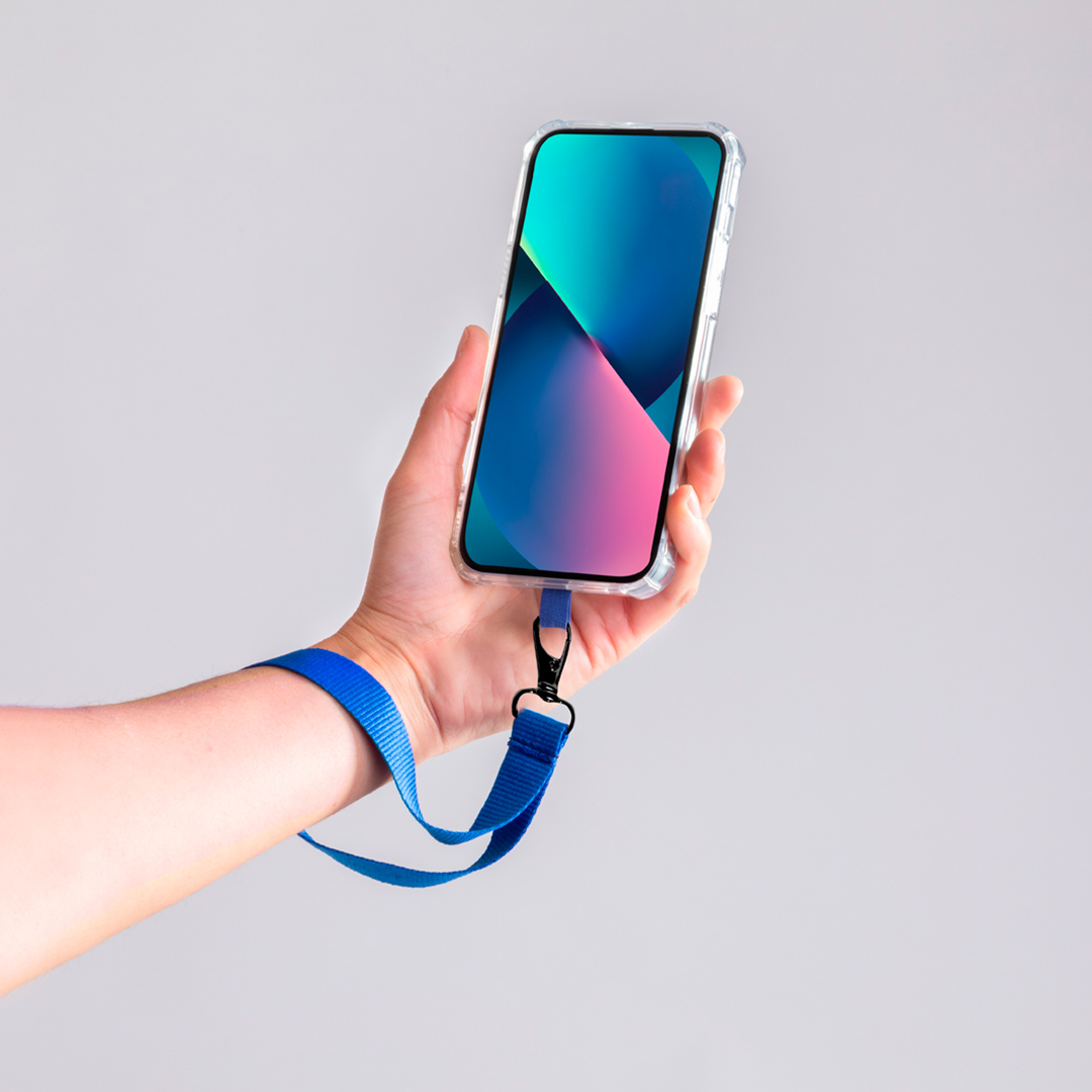 Original bracelet with holder in soft polyester, suitable for all wrists and with carrying accessory to place between the case and the smartphone. Matching carrying strap and black metal swivel carabiner.