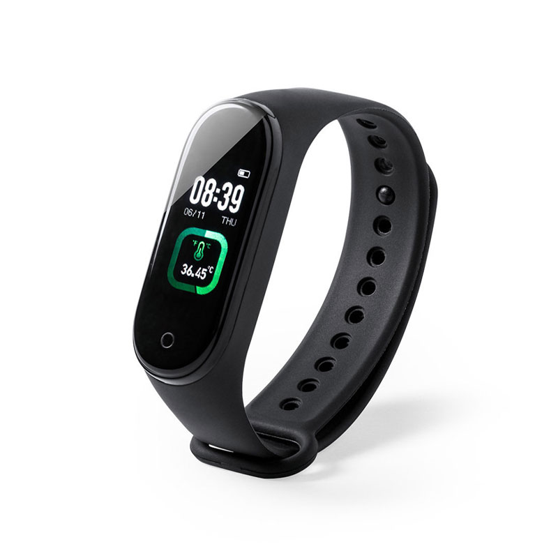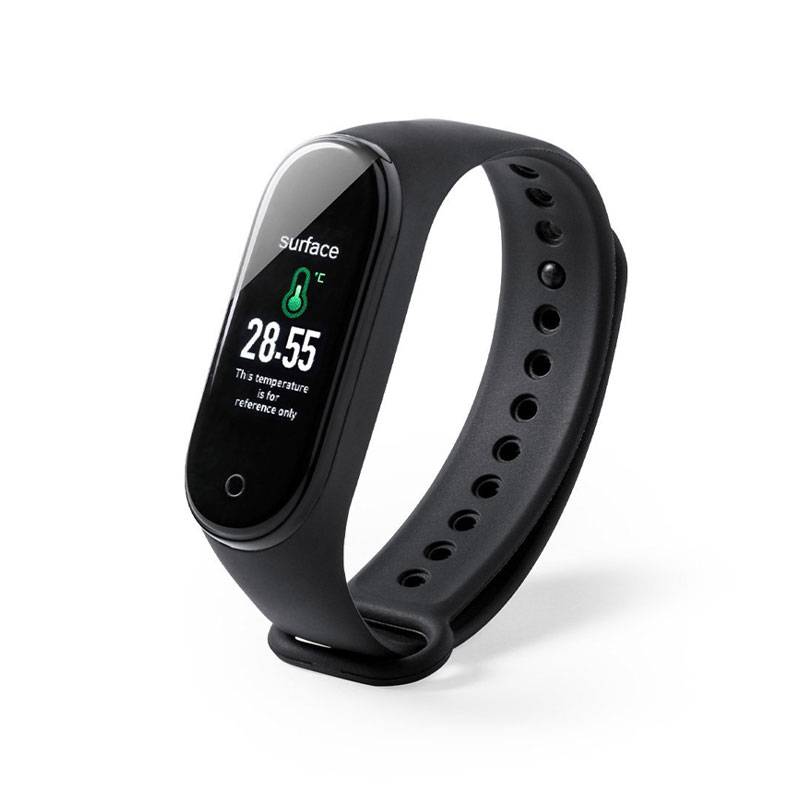 Multifunction smart bracelet with auto-measuring of corporal temperature every 5′ and App synchronization for a registry control of values (temperature and pulse rate monitoring). Also includes an alarm and several functions. Bluetooth® connection 4.0 and USB rechargeable battery. The body is made of TPU material and a TFT color screen of 0.96 inches. The app is available for iOS and Android. Presented in a box. 25.5 x 2.2 x 1.1 cm | 19 gr.