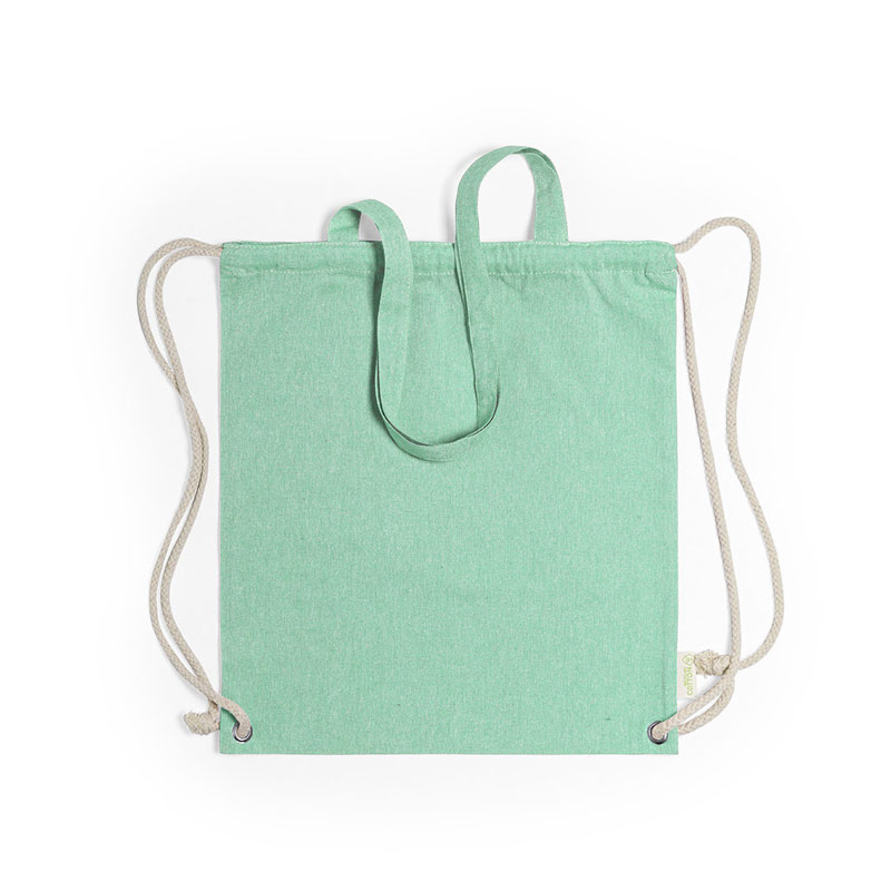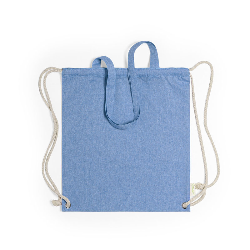 Nature line drawstring backpack, made of strong, 140g/m2 recycled cotton, with matching, 70cm, carry handles. Strings in natural cotton, with reinforced metal rings and recycled cotton distinctive in the label. Available in a wide range of colours. Resistance up to 9kg.