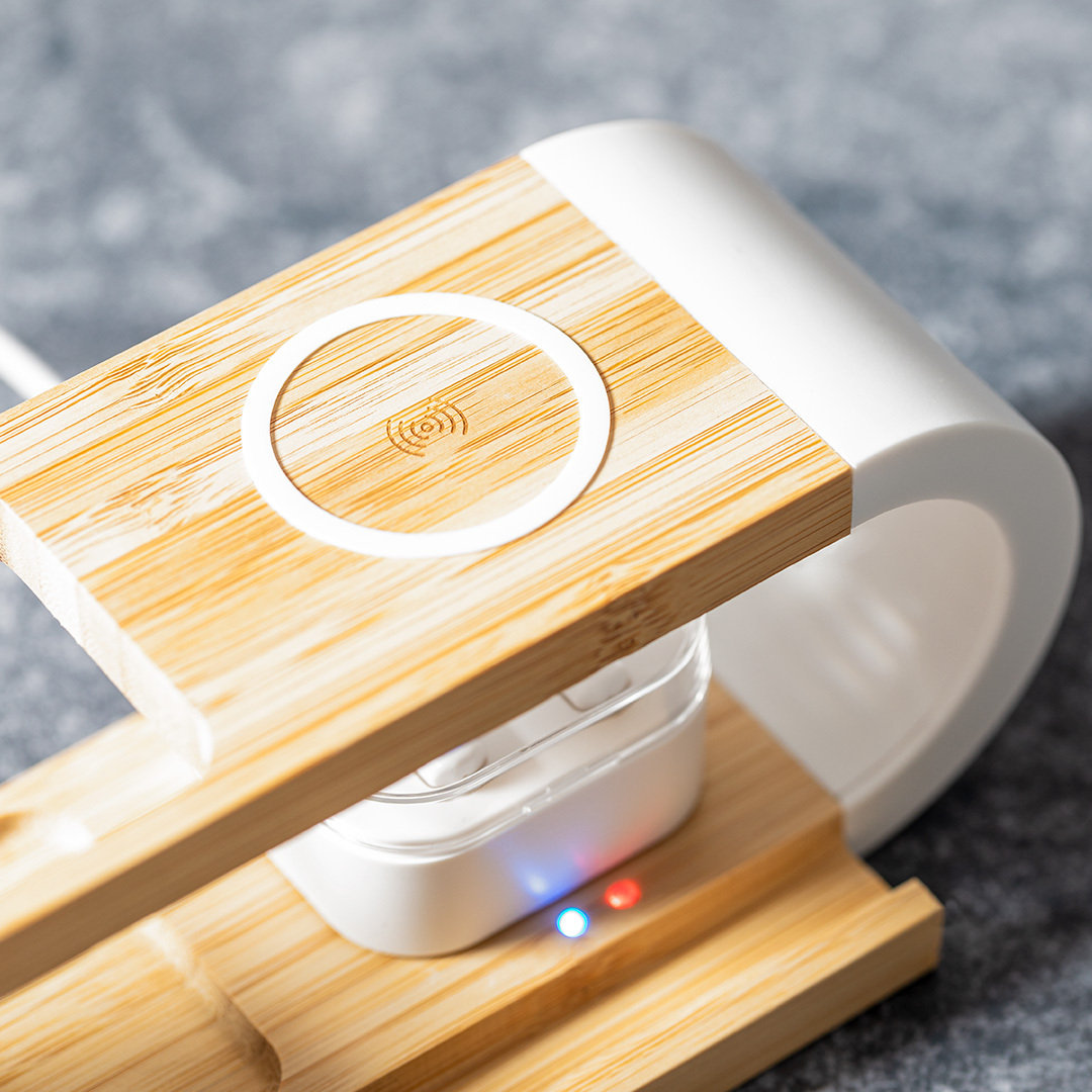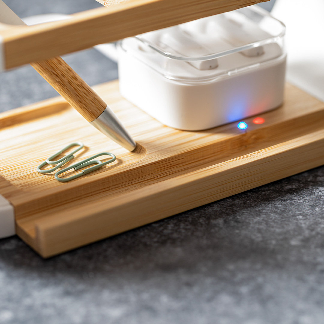 Charger Organizer Limited Edition-Line with charging station function, mobile device/tablet holder and pen/organizer. A balance between technology, sustainability and functionality that offers an innovative and sophisticated design, an exclusive premium quality design made of bamboo and ABS. With the capability to charge two devices at the same time thanks to its two 10W wireless chargers. With 100 cm USB C charger cable and instruction manual in English and Spanish included.
