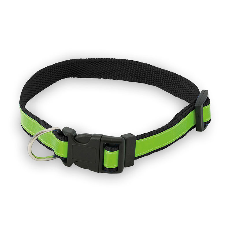 Reflective collar for pet in resistant and soft polyester of bright tones. With adjustable buckle closure strap and metal stroll accessory. Reflective. Adjustable
