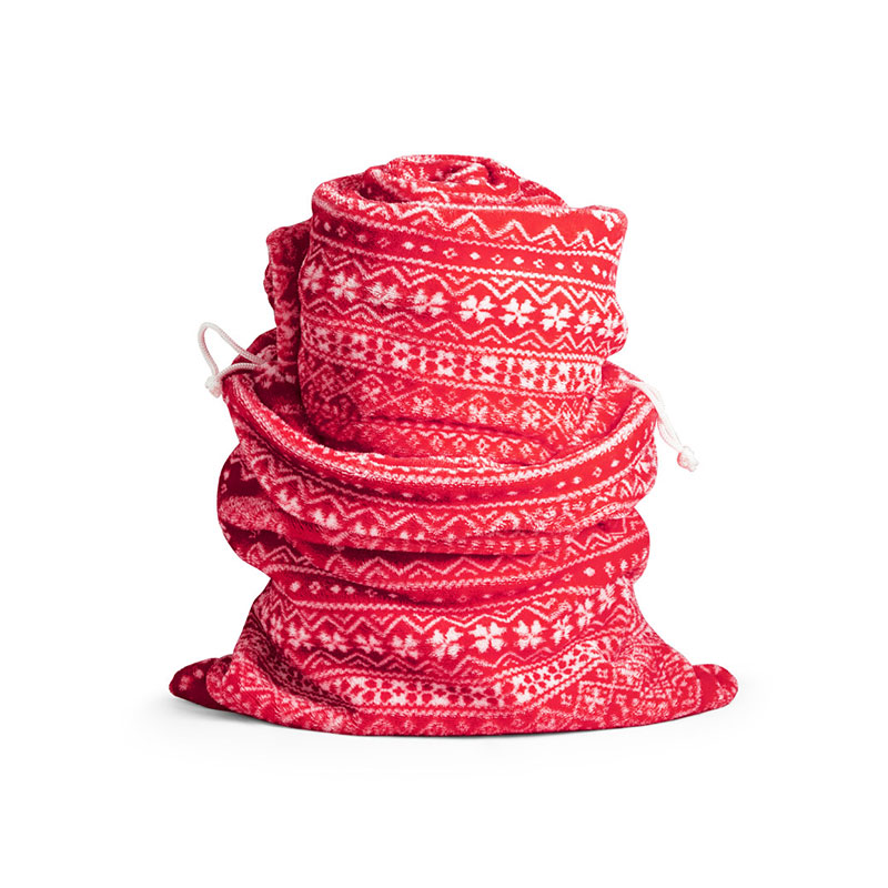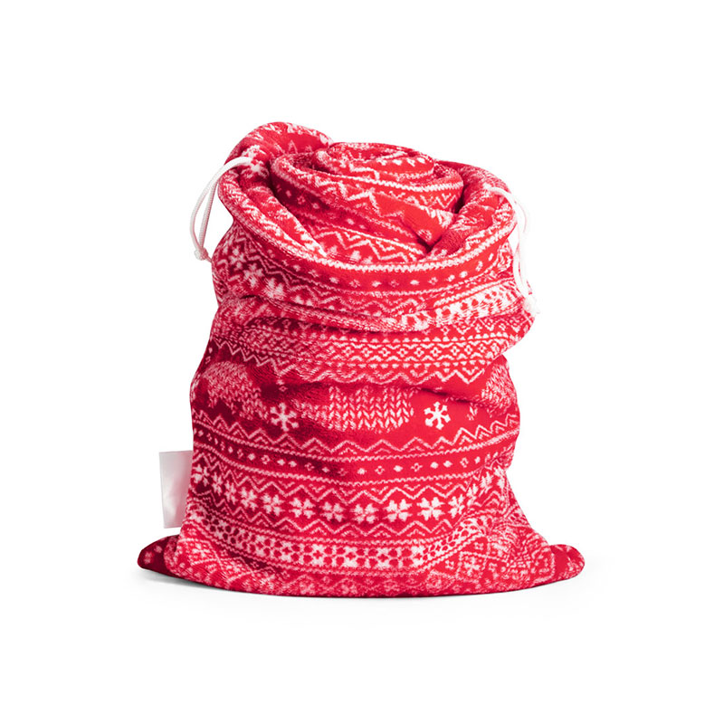 Polar blanket (240 g/m²) with velvety finish and anti-pilling treatment. The blanket includes a bag in the same material, with Christmas decorations, which closes at the top with a drawstring. Includes a customizable label. Winter.