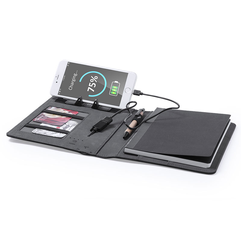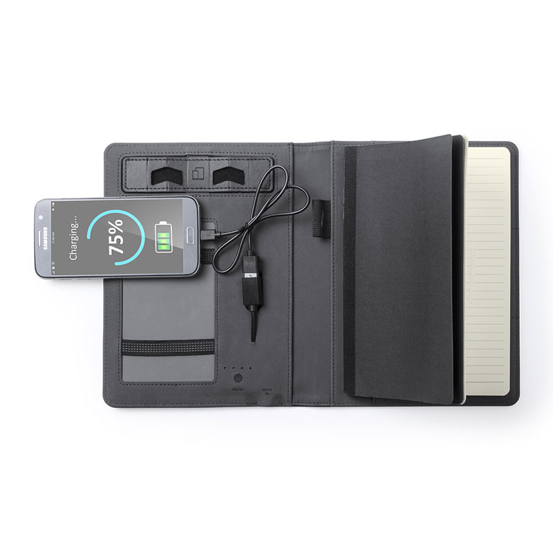 Elegant PU leather notepad with integrated, 3,000 mAh charging capacity external auxiliary battery. Including card holder, pen holder, and case for mobile devices. The easy access to the charging station via micro USB cable -included- makes this pad the perfect gadget for business and studying. 17.5 x 22.5 x 2.5 cm | 480 gr