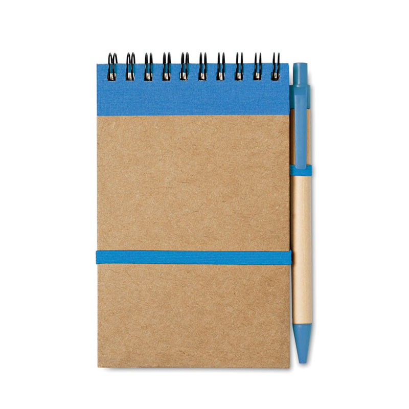 Recycled paper notebook with matching pen. Twin-wire. 70 sheets. Matching push button ball pen in recycled carton and biodegradable plastic. Blue ink. Elastic closure strap and pen holder. Ecological.