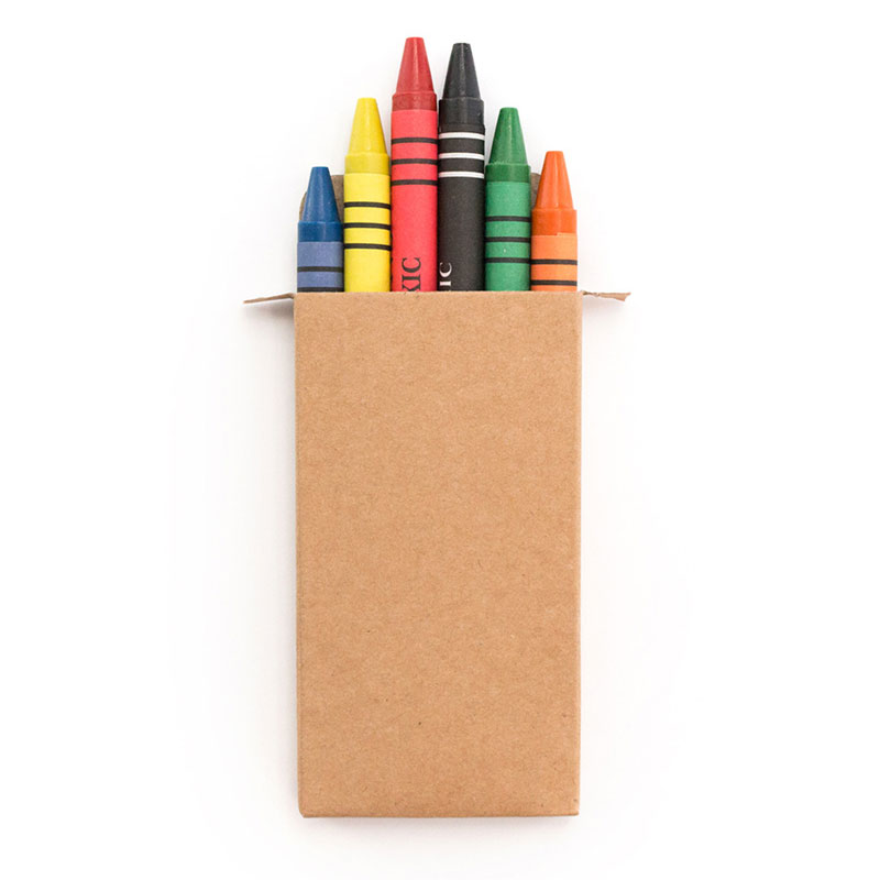 Set of 6 crayons in natural cardboard box. With cylindrical body in varied colors. Including crayons in a wide range of tones.