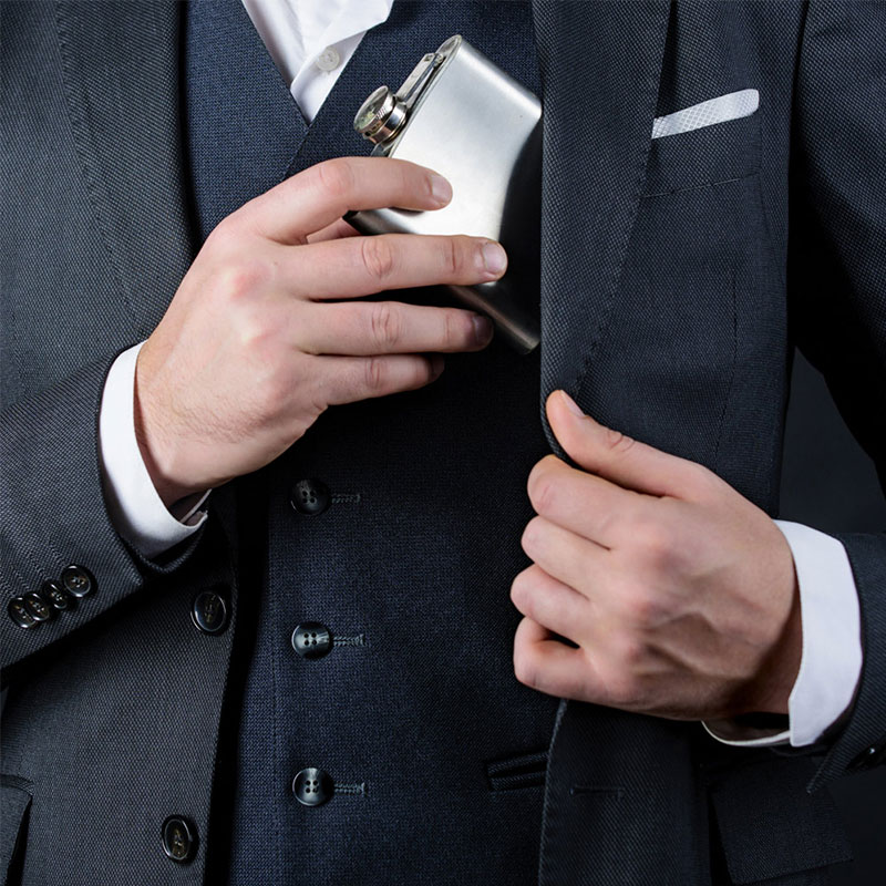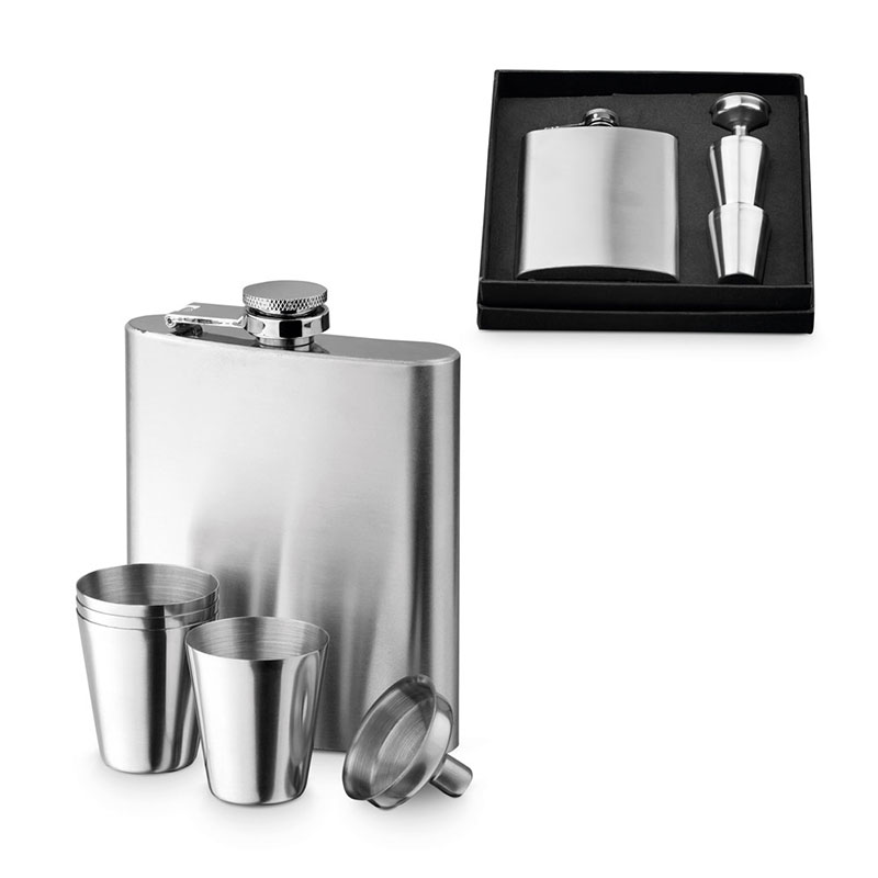 Set with stainless steel hip flask (200 ml), funnel, and 4 cups with a capacity of up to 20 ml. Supplied in a gift box. Winter. 189 x 40 x 168 mm