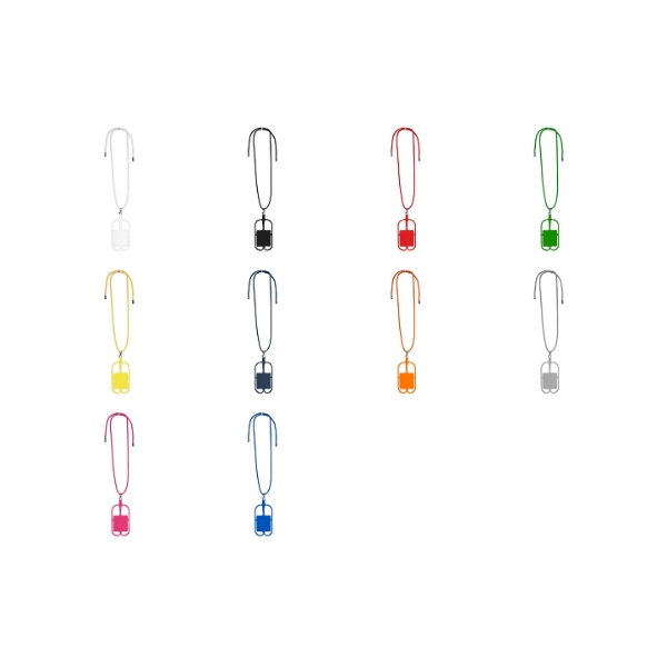 Unique lanyard for smartphone made in durable polyester and flexible silicone. With carrying accessory for all types of smartphones, suitable for all screen sizes. Neck adjuster and ends in chrome finish. Available in a wide range of colours. 7 x 60 x cm | 16 gr.
