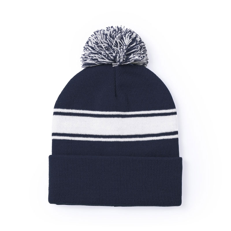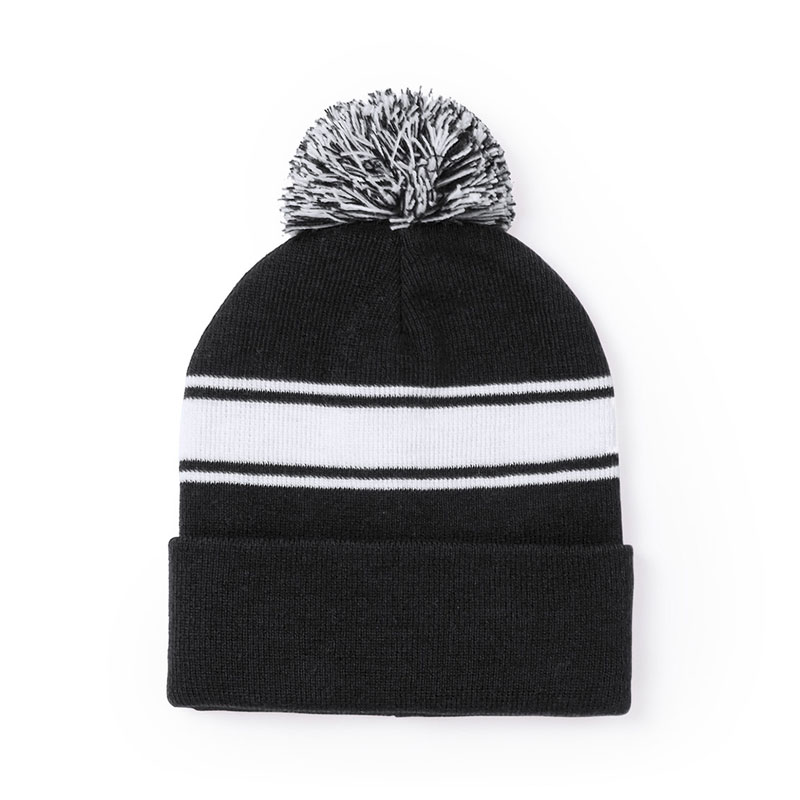 Soft and warm cap made in acrylic material, in a wide range of colors. Original design, with white front strip and bicolor pom pom in matching color. Winter.