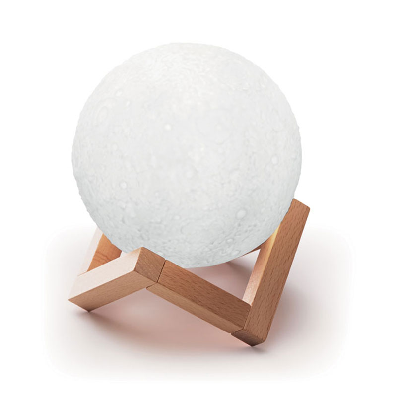 5.0 wireless moon shaped speaker in ABS. Light with 2 levels of brightness (warm and white LED). Including wooden base. 1 rechargeable Lithium 2000 mAh battery included. Output data: 3W, 4 Ohm and 5V. Includes USB charging cable. Playing time approx. 5h.