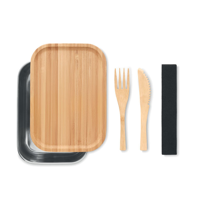 Stainless Steel lunchbox with a bamboo lid and 2 cutlery utensils with an attachable polyester band. Capacity 600ml.