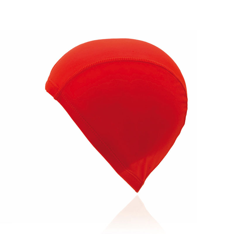 Swimming pool cap in brightly colored spandex material for a solid and soft fit on the head.