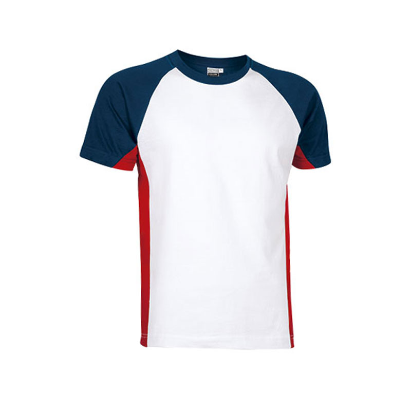 Original tricolor t-shirt with raglan sleeves, made of plain 100% cotton ring-spun knit fabric. Navy blue neck and sleeve, red stripes on the sides. Ribbed round neck and double stitching on the neckline, hem, and sleeves.