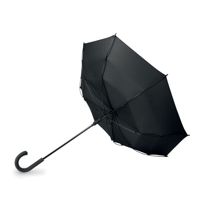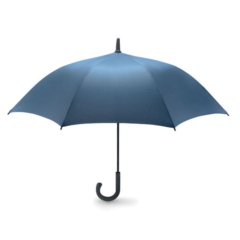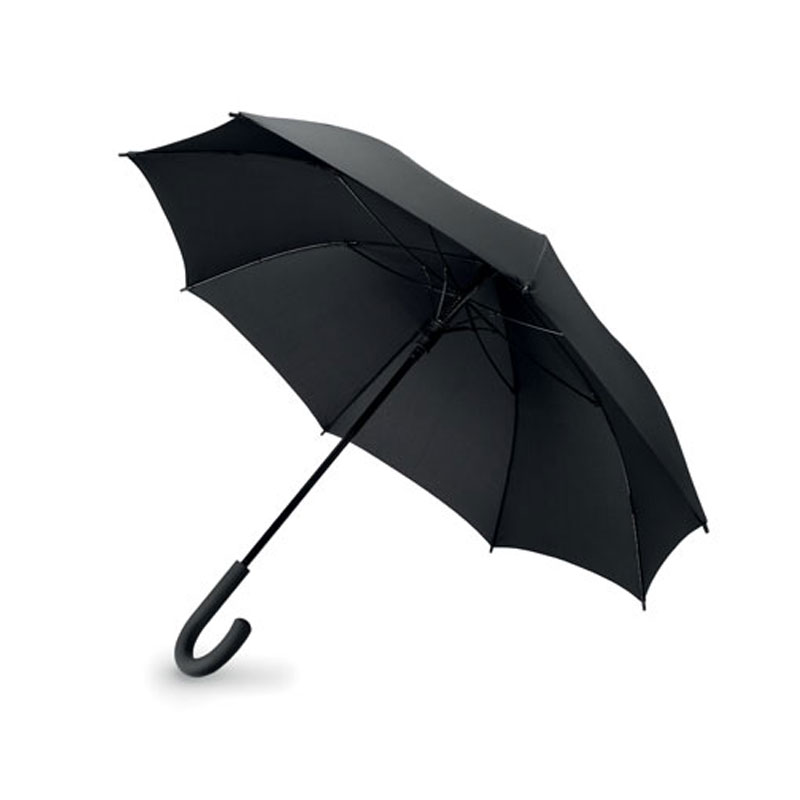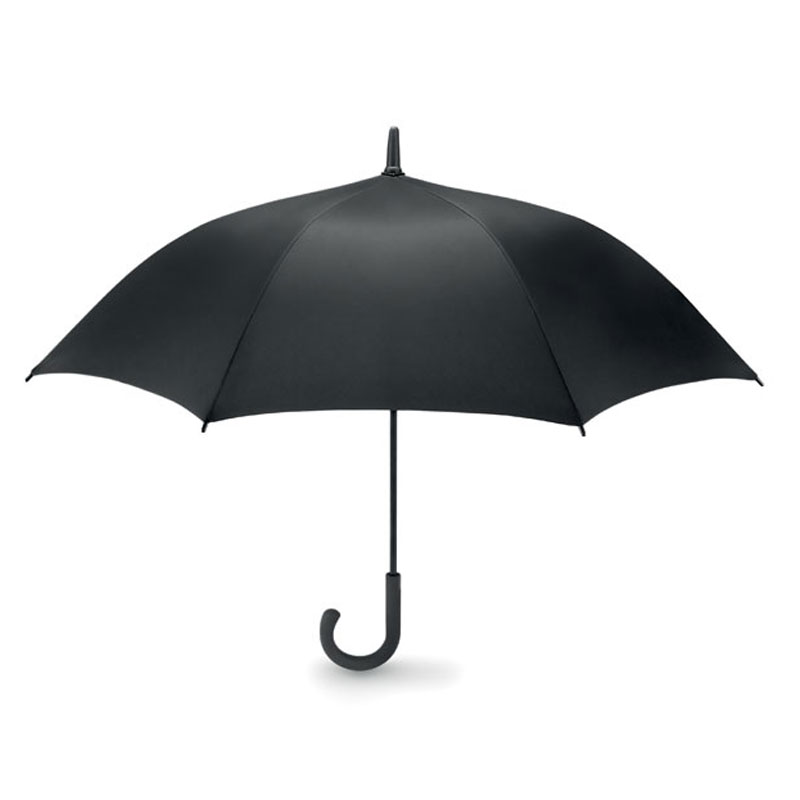 23-inch auto open umbrella in 190T pongee with plated metal shaft. Black fiberglass ribs and black plastic tips. Curved rubberized ABS handle with grey button. Manual closure. O102X58,5 CM, Normal Service: 2 Weeks