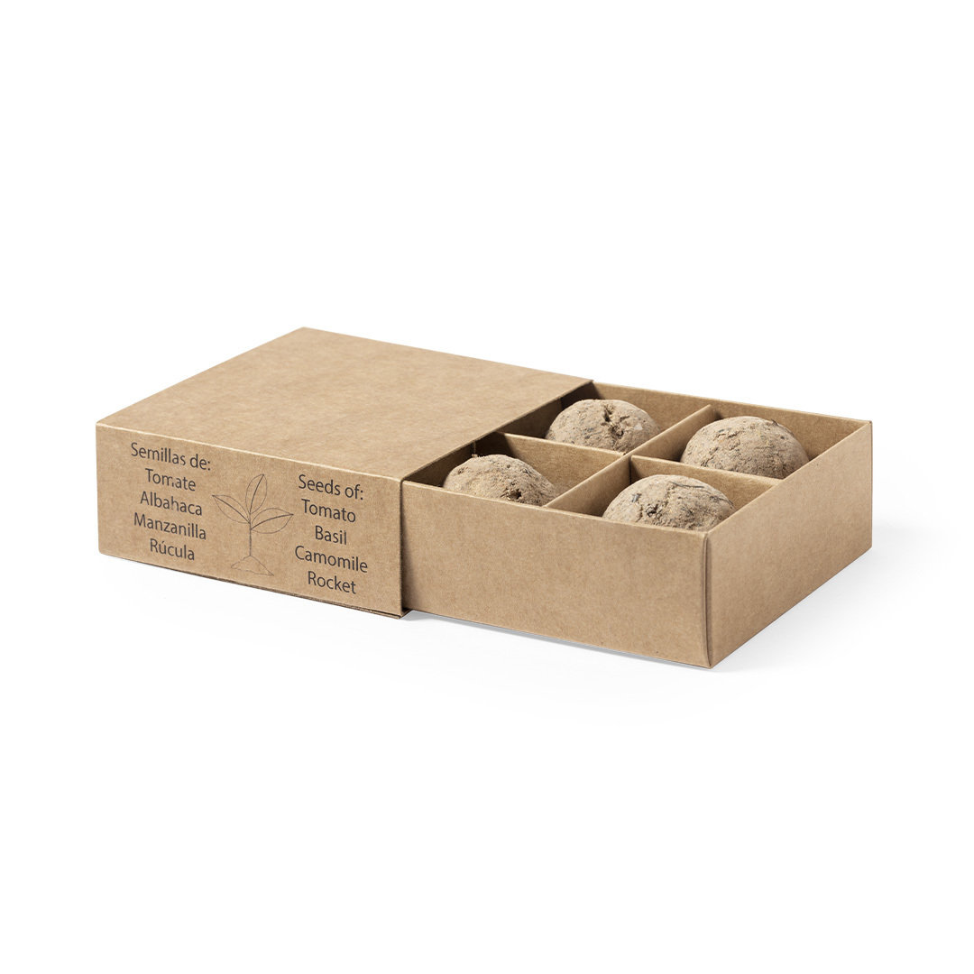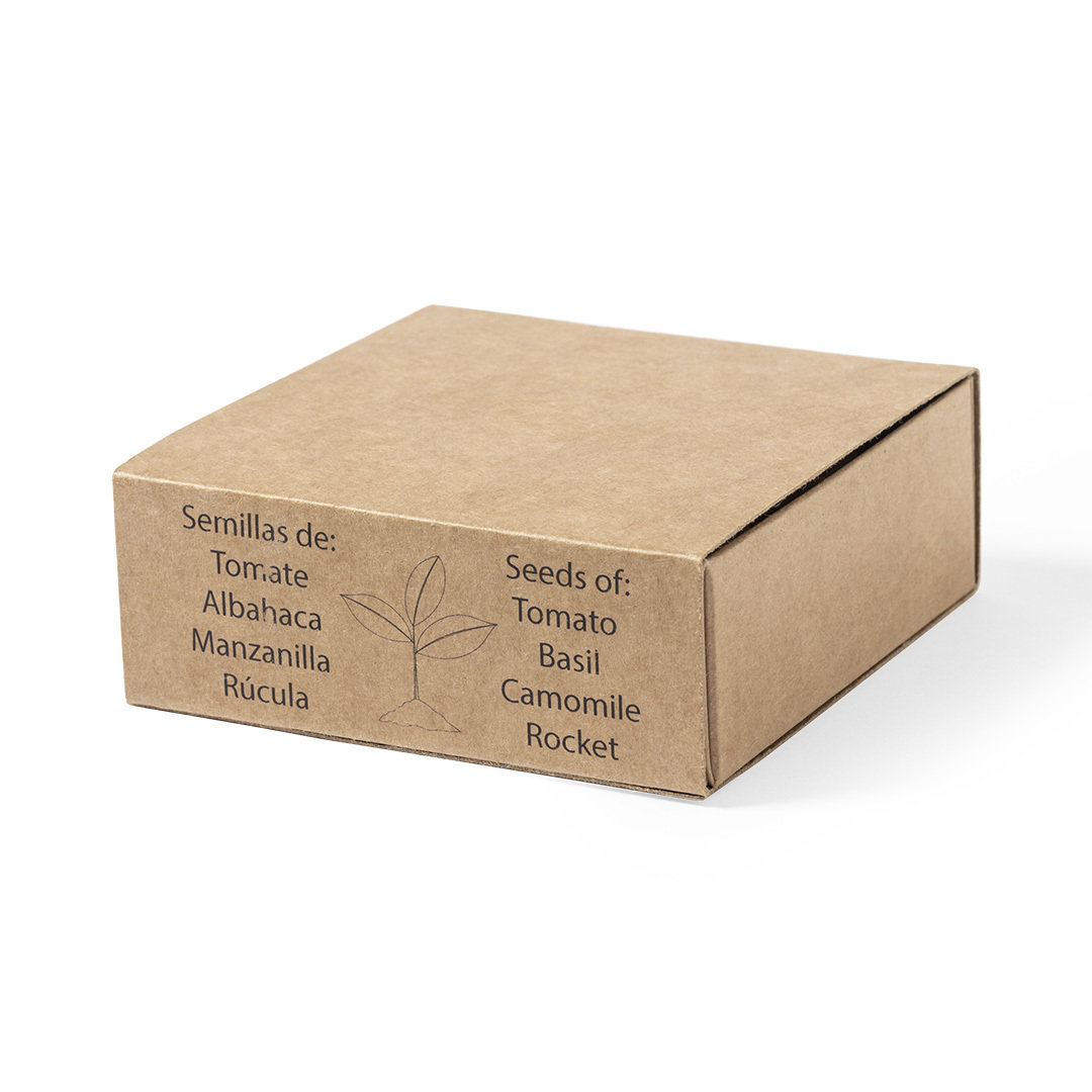 Vegetable garden kit with tomato, basil, rocket, and chamomile seeds. Presented in a recycled cardboard box with planting instructions. Made in Europe emblem, and with 4 independent compartments.