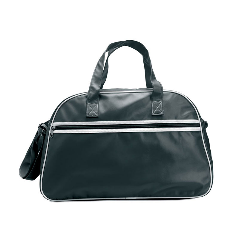 Bag in matt finish PVC with white trimming and piping. Front pocket closed by horizontal zipper. Adjustable shoulder strap. 45 x 18 x 29 cm | min: 25pcs,
