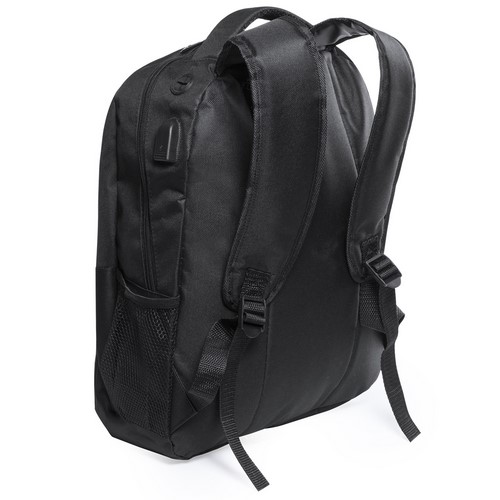 Resistant 600D polyester backpack in stylish black waterproof finish, with headphones output and an inside compartment with a USB port for a power bank connection (not included), inside and outside pockets. Inside with a padded compartment for laptops up to 15 inches and tablets up to 10 inches. Shoulder and back straps with ergonomic padding.