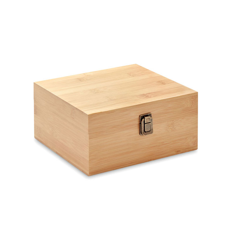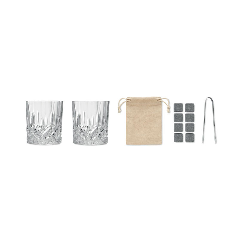 Luxury set in bamboo box for whiskey or other drinks. Includes 2 glasses (300ml), 8 reusable stone ice cubes with storage cotton pouch and tongs. 21,5 x 19,5 x 10,5cm.