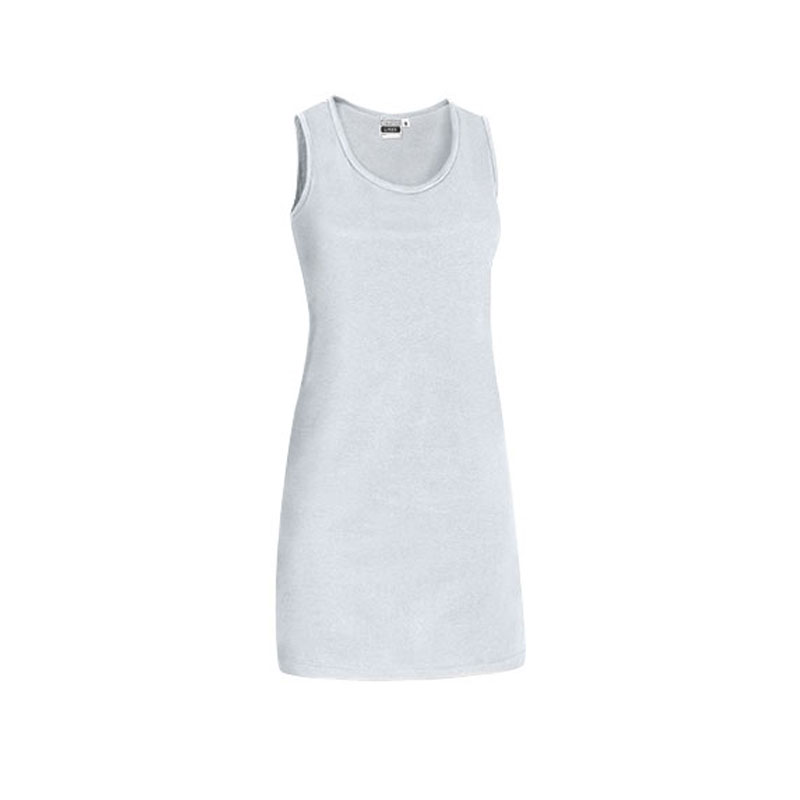 Women’s dress made of elastic fabric that adapts perfectly to the body due to its single-knit construction. Wide straps and wide round neck. Ribbed neckline and armholes and double stitched hem. Comfortable, fresh and light garment, ideal for summer.