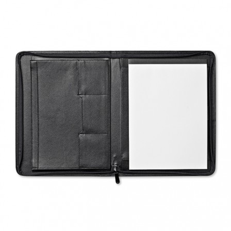 Zipped a4 size portfolio with leather cover and pu backing. Contains inner compartments and pen loop.